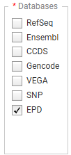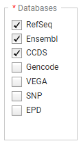 Below the Databases heading, mark the genome annotation databases that you want SureDesign to use to obtain genomic coordinate information for your specified targets. The default selections differ for Avida-DNA and Avida-Methyl designs. For targets entered in the CpG Island Lookup text box, SureDesign searches the genomic coordinates for the targets to identify CpG islands that overlap those locations. The available database sources are: