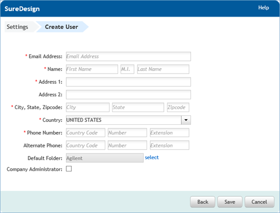 You can create user accounts for new SureDesign users in your workgroup from the Settings > Create User dialog box.